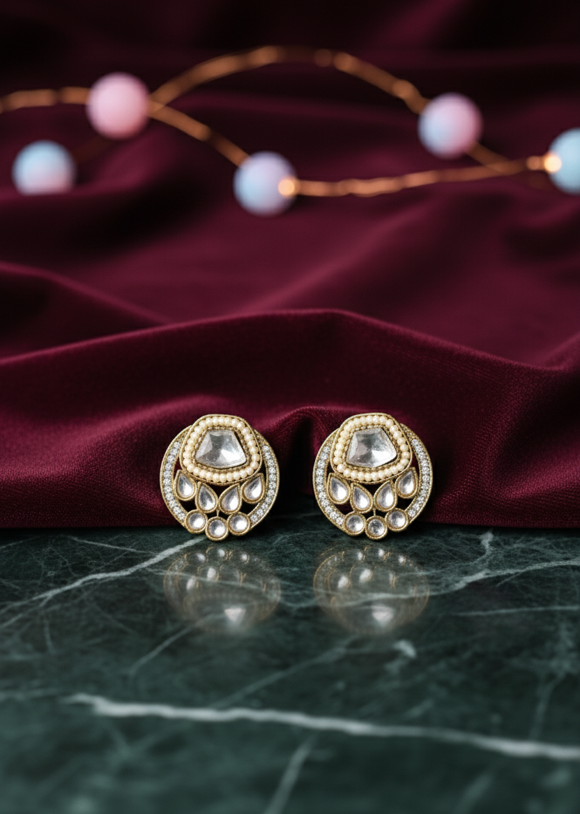 Grace your festive and traditional looks with the timeless charm of our Crystal Royal Kundan Stud Earrings. Designed with a stunning clear crystal centerpiece and bordered with delicate pearl beading, these earrings feature beautifully arranged kundan stones in a royal circular design.