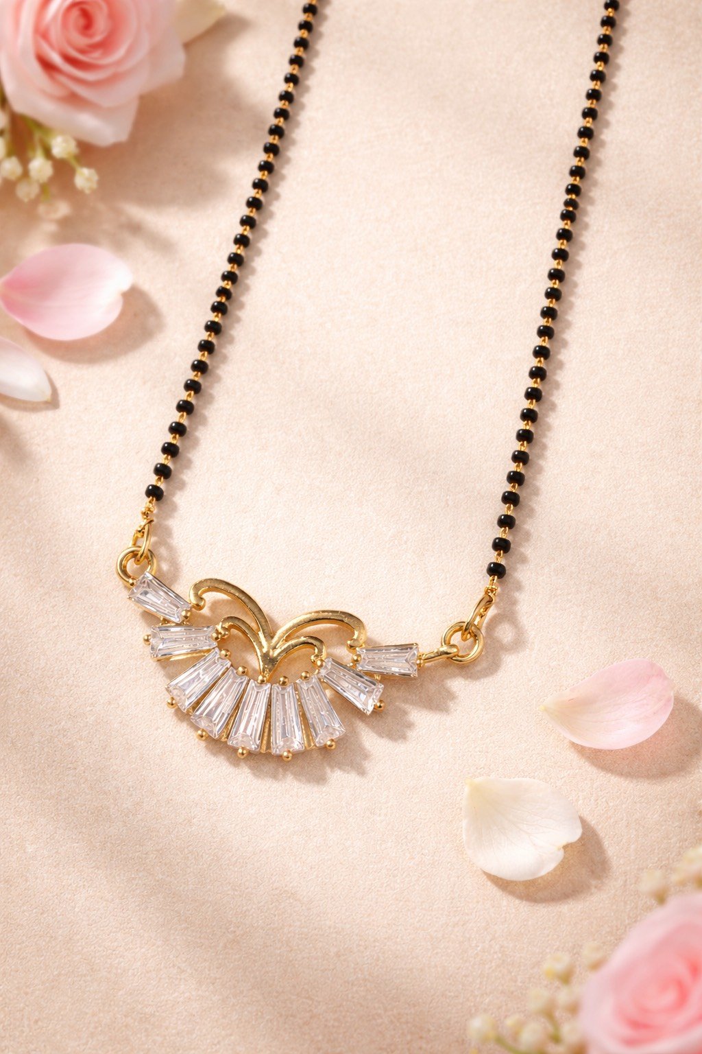The mangalsutra features a gold-plated designer pendant embellished with sparkling crystal stones, paired with a classic black beaded chain for a graceful and premium appearance.