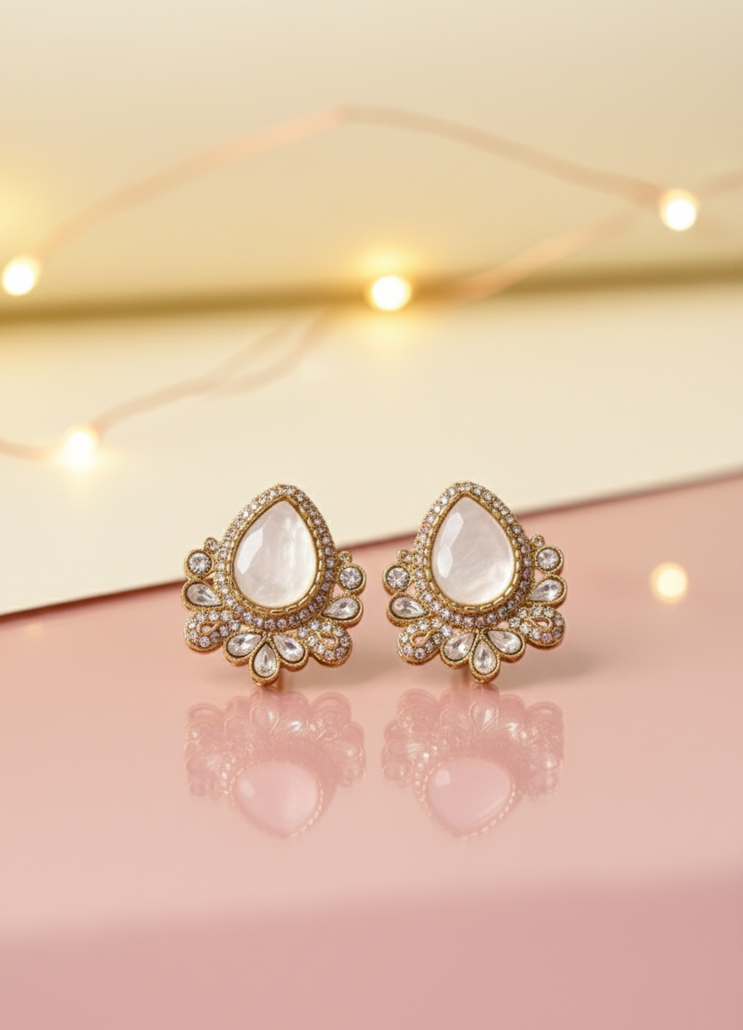 & Free ShippingElegant gold-plated stud earrings with a pear-shaped mother-of-pearl center surrounded by sparkling kundan stones. Lightweight, classy, and perfect for festive and ethnic looks. Ideal for weddings, functions, and traditional styling.