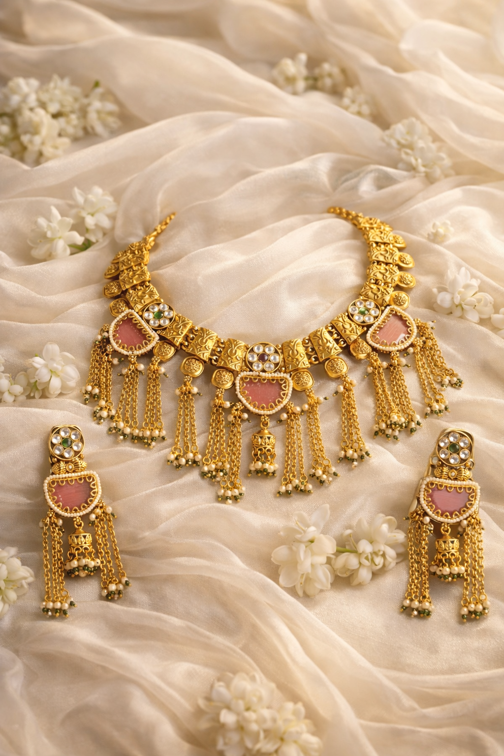 Royal Antique Gold Bridal Necklace Set with Kundan & Pearl Drops