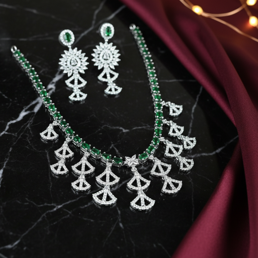 & Free ShippingA luxurious silver-finish AD necklace set featuring elegant fan-style drops and rich emerald stones. Perfect for weddings, party wear, and statement festive looks. Lightweight, premium quality, and beautifully crafted.
