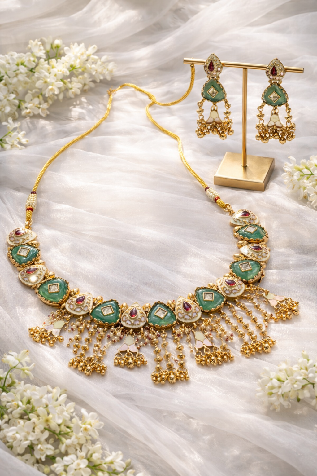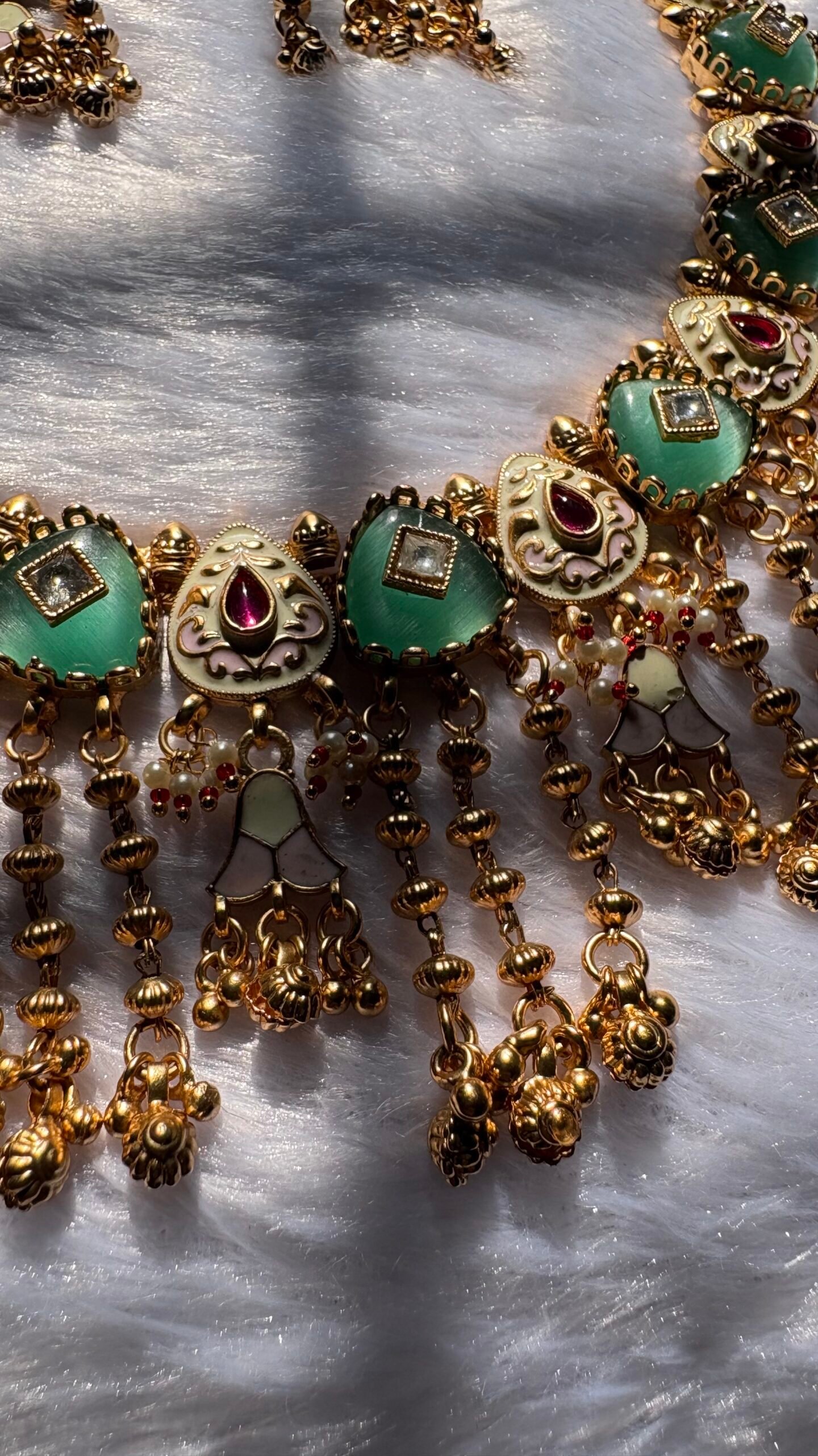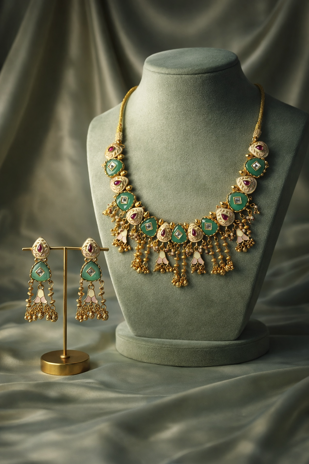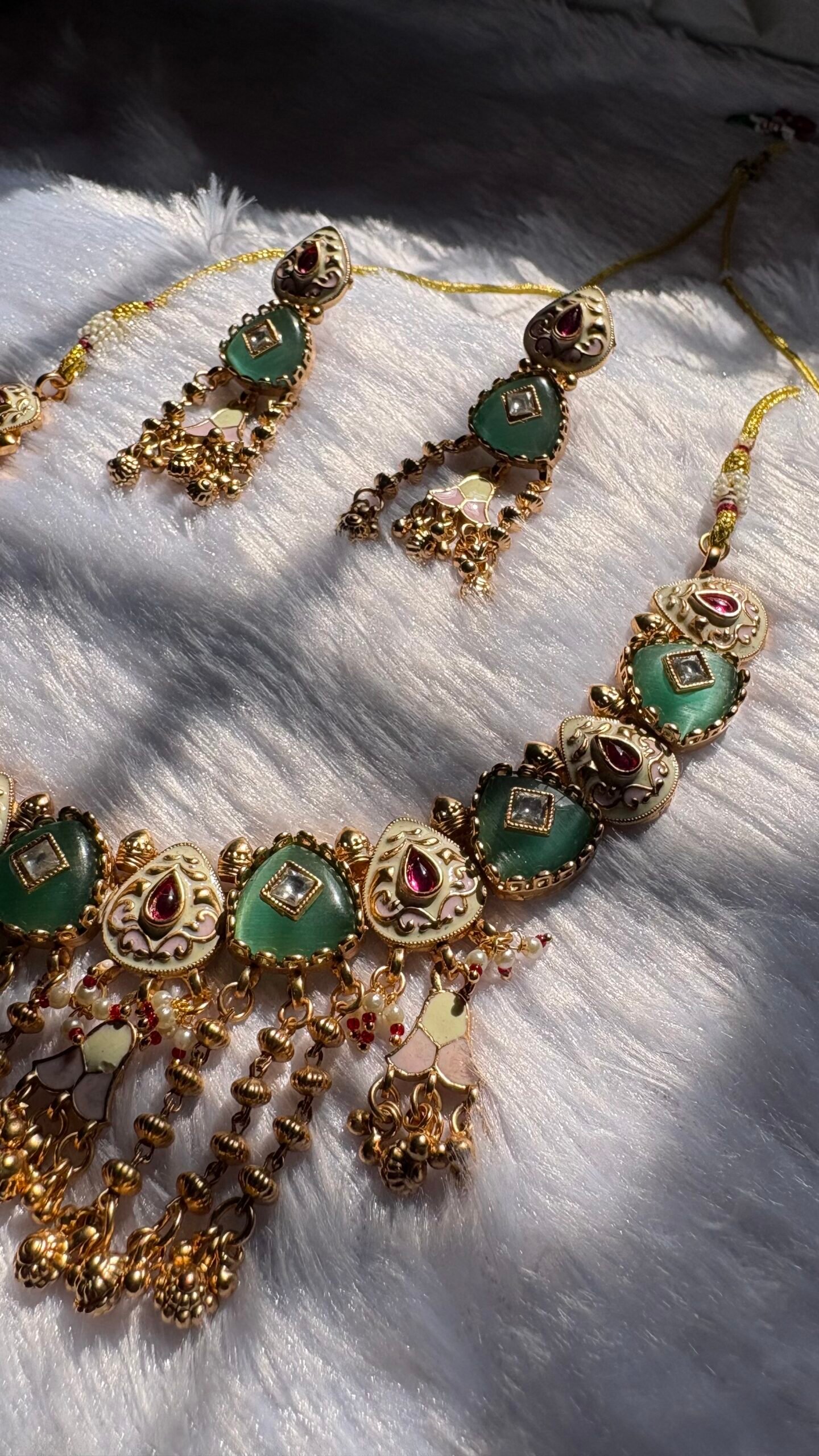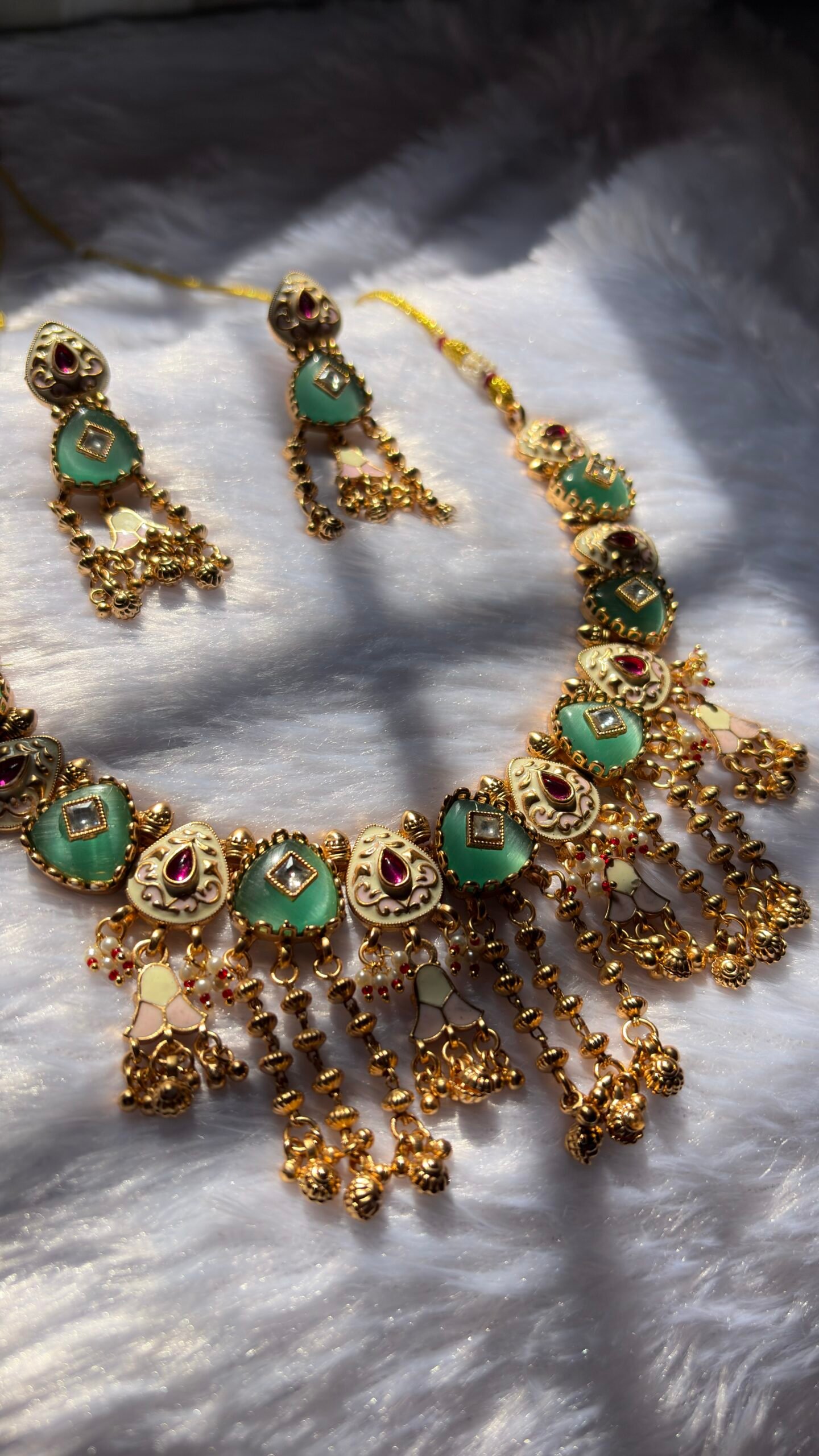 Elegant traditional necklace set featuring green kundan stones, ruby accents, and antique gold detailing with dangling bead work. Paired with matching earrings, this set is perfect for weddings, festive occasions, and ethnic celebrations.